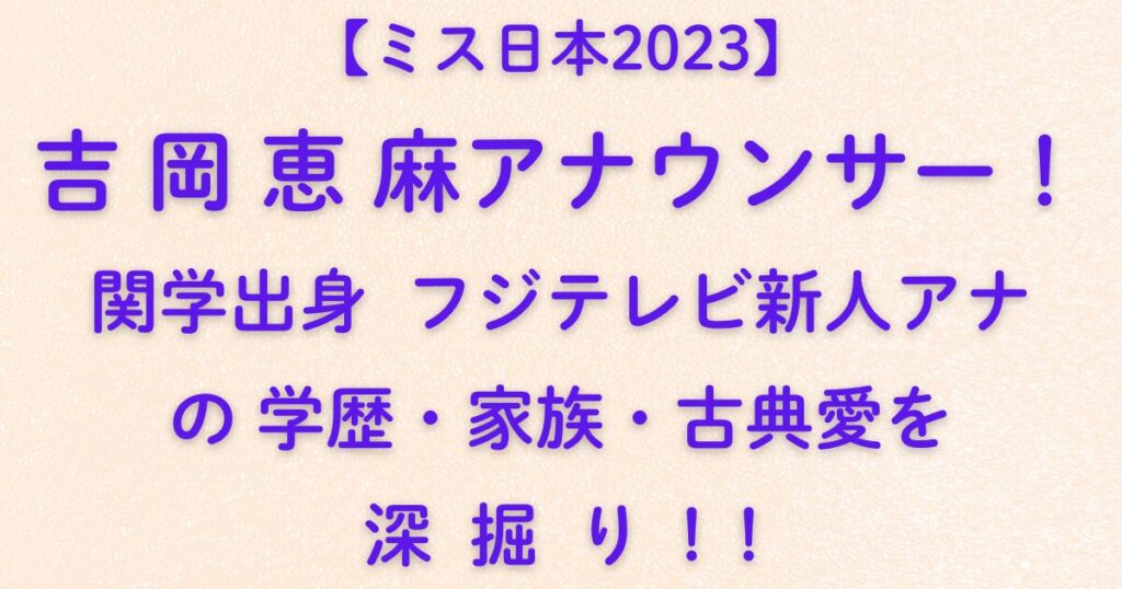 🎤【ミス日本2023】吉岡恵麻アナウンサー!関学出身フジテレビ新人アナの学歴・家族・古典愛を深掘り!!2025年春、フジテレビに新たな風を吹き込んだのが吉岡恵麻(よしおか・えま)アナウンサーです。 2023年に「ミス日本グランプリ」を受賞した彼女は、173cmの長身と知的な雰囲気、そして古典文学を愛する独特の感性で注目を集めています。 大学時代からアナ...