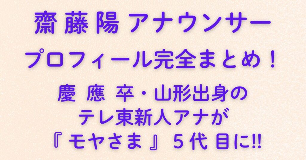 齋藤陽アナウンサー プロフィール完全まとめ!慶應卒・山形出身のテレ東新人アナが『モヤさま』5代目に!!2025年、テレビ東京の新人アナウンサーとして注目を集めているのが、齋藤陽(さいとう・よう)アナウンサーです。 慶應義塾大学法学部を卒業し、2025年7月から人気番組『モヤモヤさまぁ〜ず2』の5代目アシスタントに抜擢! フレッシュながらも芯のあるコメ...