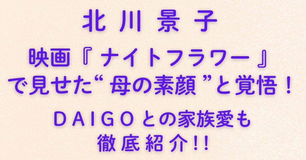 【 北 川 景 子 】映画『ナイトフラワー』で見せた“母の素顔”と覚悟!DAIGOとの家族愛も徹底紹介!!2025年11月28日公開の映画『ナイトフラワー』で、北川景子さんが見せる“母の覚悟”が大きな話題を呼んでいます。 ほぼすっぴん、青髪で挑むヒロイン・永島夏希は、社会の片隅で懸命に生きる母親。 その姿は、2児の母である北川景子さん自身の生き方とも重な...