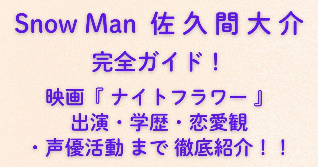 Snow Man 佐久間大介完全ガイド!映画『ナイトフラワー』出演・学歴・恋愛観・声優活動まで徹底紹介!!Snow Manの佐久間大介さんといえば、明るくてオタク気質、そして誰よりも全力な“ピンク担当”として大人気ですよね。 そんな彼が、2025年11月公開の映画『ナイトフラワー』で見せる“黒髪の新境地”に、ファンの期待が高まっています! この記事では、映画の...