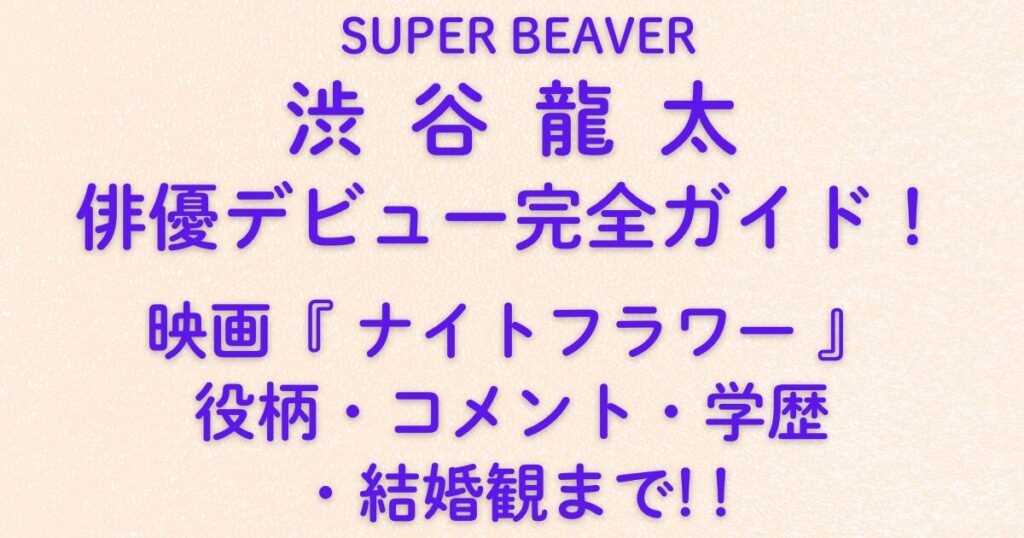 🎤 SUPER BEAVER 渋谷龍太の俳優デビュー完全ガイド!映画『ナイトフラワー』役柄・コメント・学歴・結婚観まで!!人気ロックバンド**SUPER BEAVERのボーカル・渋谷龍太(しぶやりゅうた)**さんが、ついに俳優デビュー! 2025年11月28日公開の映画『ナイトフラワー』では、北川景子さん演じる主人公と対峙する“夜の帝王・サトウ”役を熱演します。 音楽では愛と人間を真...