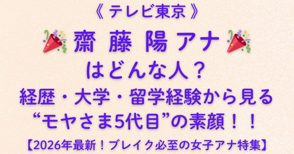 《テレビ東京》🎉 齋藤陽アナ 🎉 はどんな人?経歴・大学・留学経験から見る“モヤさま5代目”の素顔!!【2026年最新!ブレイク必至の女子アナ特集】