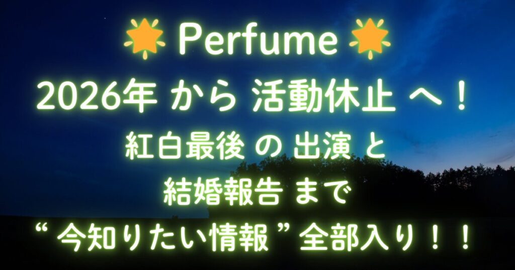 2025年、Perfumeにとって大きな節目となるニュースが続き、ファンの間でも驚きと応援の声が広がっています。 あ〜ちゃんの結婚発表、そして**2026年から活動休止(コールドスリープ)**という重大発表。 そして年末には、**紅白歌合戦での“活動休止前ラス... -