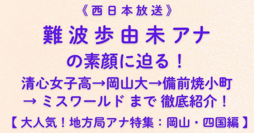 《西日本放送》難波歩由未アナの素顔に迫る!清心女子高→岡山大→備前焼小町→ミスワールドまで徹底紹介!【 大人気!地方局アナ特集:岡山・四国編 】