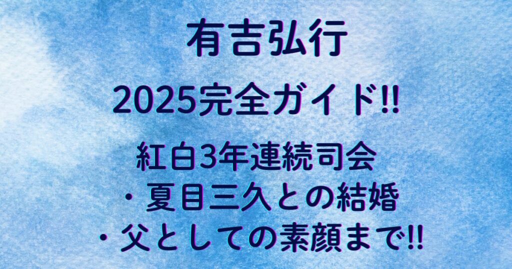 🟥 有吉弘行2025完全ガイド|紅白3年連続司会・夏目三久との結婚・父としての素顔まで!!お笑い界を代表する司会者・有吉弘行さん(ありよし・ひろいき)。 『進め!電波少年』でのブレイクから一発屋のどん底を経験し、再びトップへと返り咲いた男です。 毒舌とユーモアを絶妙に操るバランス感覚で、テレビ界の“潤滑油”とも呼ばれる存在に。 20...