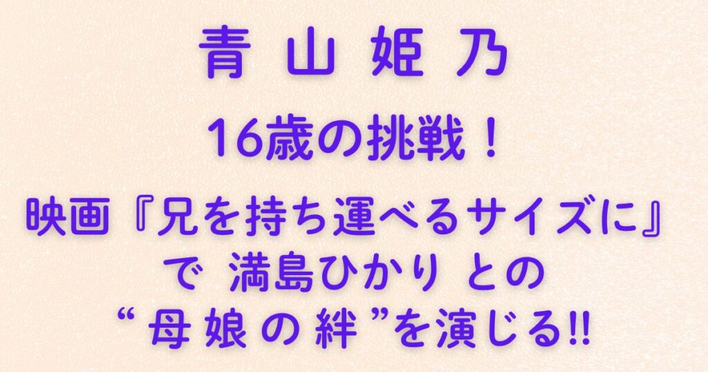 青山姫乃、16歳の挑戦!映画『兄を持ち運べるサイズに』で満島ひかりとの“母娘の絆”を演じる!!山形県出身の16歳、青山姫乃(あおやま・ひめの)さんが、ついにスクリーンデビュー! 2025年11月公開の映画『兄を持ち運べるサイズに』(監督:中野量太)で、満島ひかりさん演じる母の娘・満里奈役を熱演します。 ニコラモデルとして注目を集めていた彼...