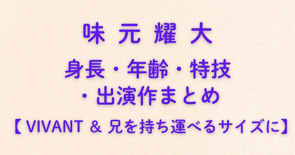 味元耀大|身長・年齢・特技・出演作まとめ【VIVANT&兄を持ち運べるサイズに】今、ドラマや映画ファンの間で静かに注目を集めている13歳の俳優・味元耀大(みもとようた)くん。 『VIVANT』での堺雅人さんの幼少期役、そして2025年公開の映画『兄を持ち運べるサイズに』では柴咲コウさん・オダギリジョーさんと共演するなど、名だたる...