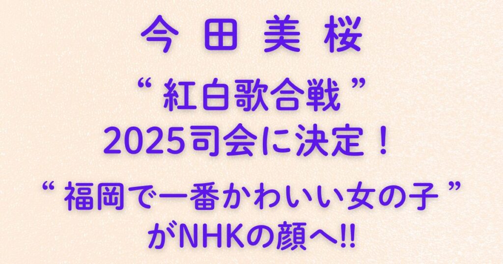 今田美桜、紅白歌合戦2025司会に決定!“福岡で一番かわいい女の子”がNHKの顔へ!!2025年10月、NHKが発表した「第76回紅白歌合戦」の司会者に今田美桜さんの名前が!🎉 福岡で“地元一かわいい”と話題だった少女が、いまや国民的女優として紅白の大舞台に立ちます。 朝ドラ『あんぱん』のヒロインを経て、NHK放送100年という節目の...