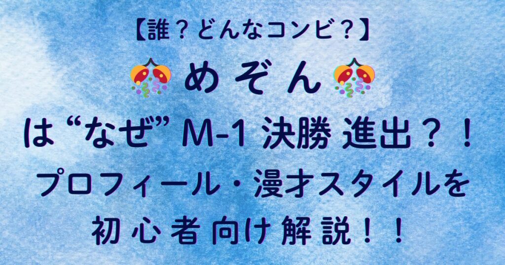 2025年のM-1グランプリ決勝に初進出し、一気に注目度が高まっている漫才コンビ**「めぞん」。 「名前は聞いたけどどんな芸人?」「どこが面白いの?」そんな初心者の方でもスッと理解できるよう、 この記事ではめぞんがなぜM-1決勝へ進めたのか、その理由... -
