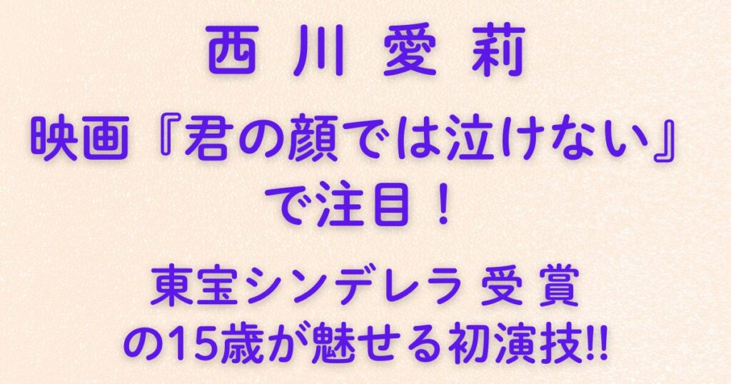 西川愛莉|映画『君の顔では泣けない』で注目!東宝シンデレラ受賞の15歳が魅せる初演技!!2025年11月14日公開の映画『君の顔では泣けない』で、注目を集めているのが東宝シンデレラ出身の新人女優・西川愛莉(にしかわ あいり)さんです。 まだ15歳ながらも、透明感と芯のある演技で観る人の心を掴む存在。 高校生の“入れ替わり”という難しい役ど...