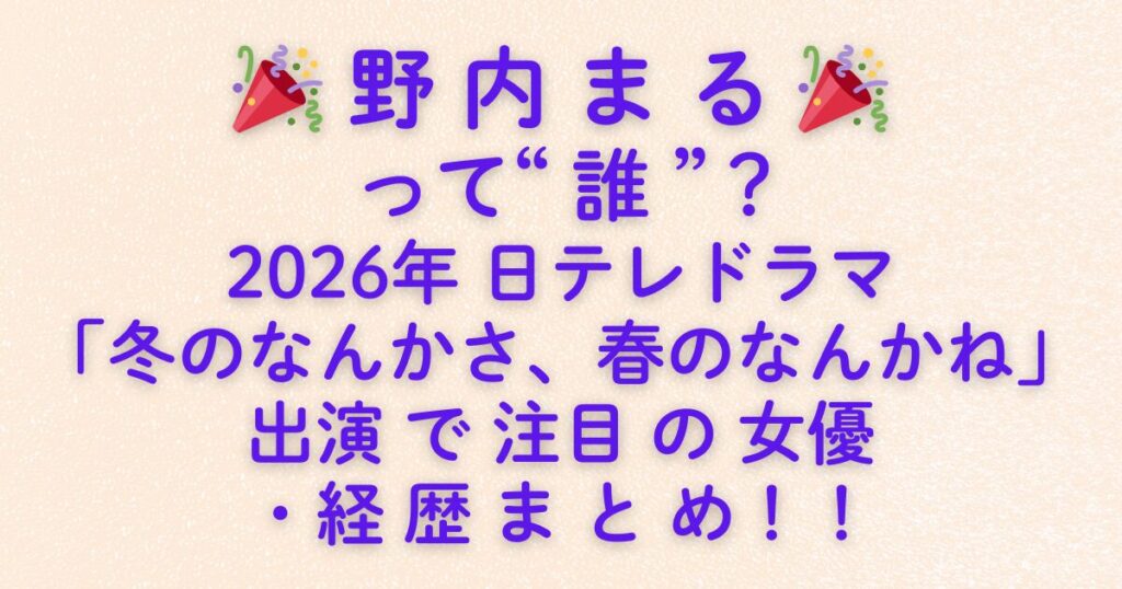 2026年1月スタートの日本テレビ水曜ドラマ**「冬のなんかさ、春のなんかね」**に出演し、じわじわと注目を集めている女優・野内まるさん。 「名前は聞いたことあるけど、どんな人?」「なぜここまで話題になっているの?」と気になっている方も多いのでは... -